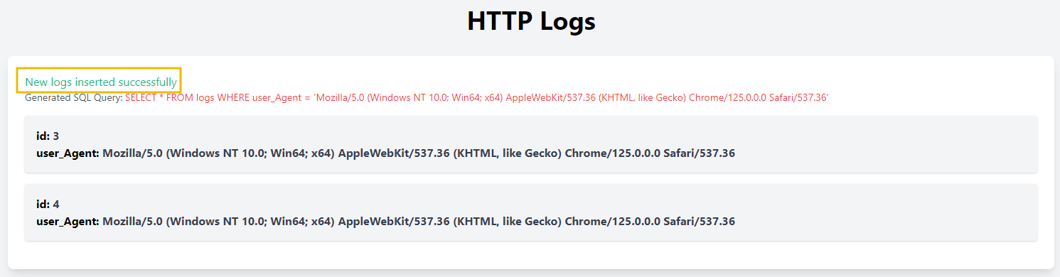 In this example, a web application logs the User-Agent header from HTTP requests into a table named logs in the database. The application provides an endpoint at http://10.10.72.204/httpagent/ that displays all the logged entries from the logs table. When users visit a webpage, their browser sends a User-Agent header, which identifies the browser and operating system. This header is typically used for logging purposes or to tailor content for specific browsers. In our application, this User-Agent header is inserted into the logs table and can then be viewed through the provided endpoint.